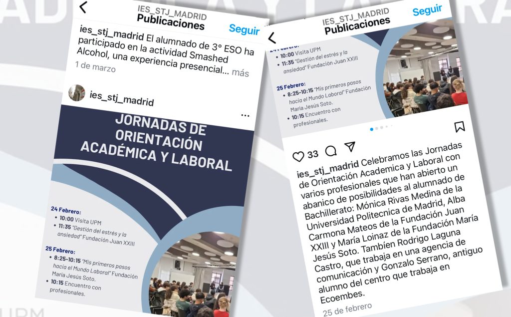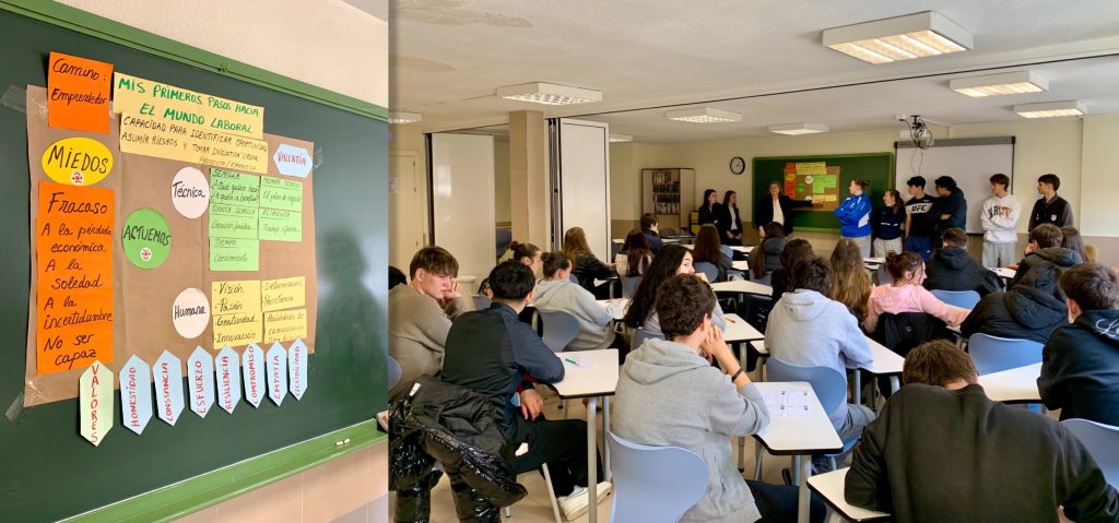El primer trimestre también se ha impartido el mismo taller en otros dos centros madrileños: en el Colegio Villamadrid en el mes de enero, para dos grupos de 1º de Bachillerato. Desde este centro, la responsable de la Jefatura de Estudios opinaba que “la percepción tanto nuestra como docentes como la de los alumnos que asistieron a los talleres, fue muy satisfactoria. Nos pareció que eran muy dinámicos y los alumnos quedaron encantados, así que os agradecemos enormemente vuestra labor.”; en febrero, con motivo de sus jornadas de orientación, también 70 estudiantes del IES Santa Teresa, que escucharon con atención las explicaciones y participaron en las dinámicas propuestas por la formadora.